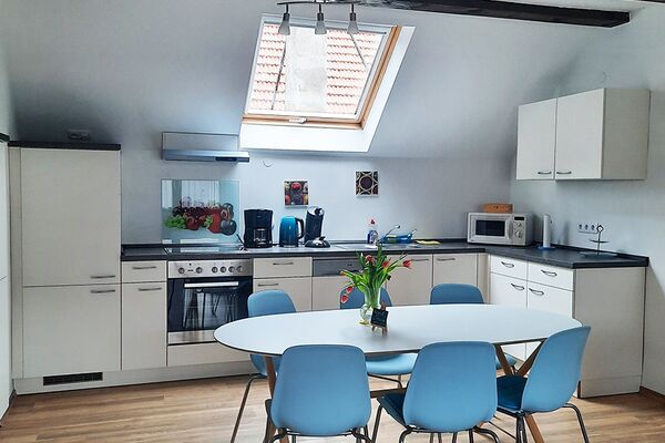 - Kücheneinrichtung: Herdplatte, Backofen, Kühlschrank mit Eisfach, Mikrowelle, Kaffeemaschine (mit Filter oder Senseo), Wasserkocher, Toaster, Spülmaschine.