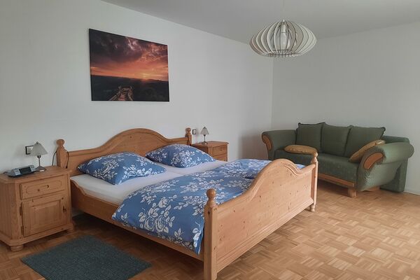 Mit einem Doppellbett (200x200) in dem großen Schlafzimmer und einer ausziehbaren Couch (140 x 190) im Wohnzimmer besteht Schlafgelegenheit für bis zu 4 Personen. Die Wohnung verfügt selbstverständlich über einen W-LAN Zugang und Kabelfernsehen. Für unsere kleinen Gäste halten wir eine vollständige Ausstattung bereit: vom Babybett bis zum Flaschenwärmer über einen Kleinkindersitz. Im Eingangsbereich finden Sie einen Gästekühlschrank zur Selbstbedienung, in dem wir für Sie eine Auswahl unseres Wein- Saft- und Sektangebotes bereit halten.